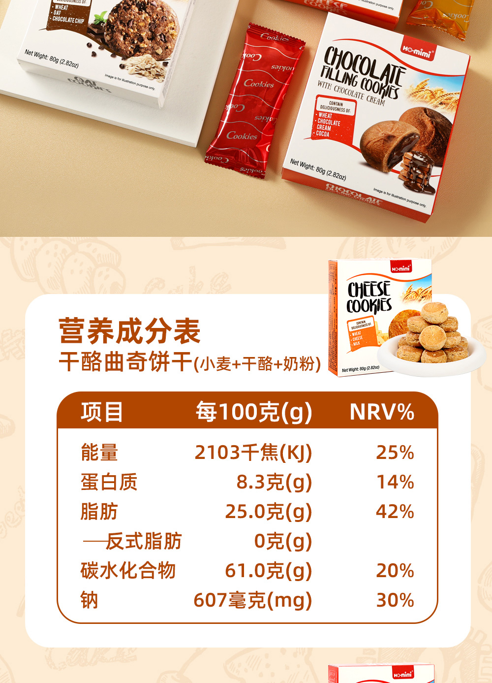 產(chǎn)品描述 推薦產(chǎn)品 HO.mimi牌飛行小圓餅(混合口味) Ho.mimi牌裹衣花生-160g 奶酪?jiàn)A心餅干-360g HO.mimi牌梳打餅干-268g HO.mimi牌蘇打餅干-500g HO.mimi牌消化餅干(400g/罐)